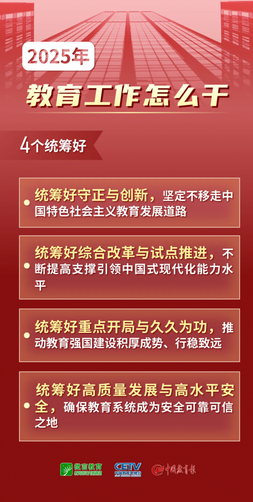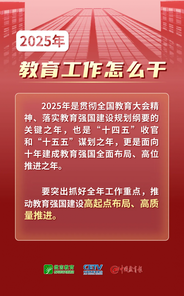 1月9日—10日,2025年全国教育工作会议在北京举行。会议以习近平新时代中国特色社会主义思想为指导,全面贯彻落实党的二十大和二十届二中、三中全会精神,深入学习贯彻全国教育大会精神和习近平总书记关于教育的重要论述,总结工作、分析形势,统一思想、凝聚共识,围绕组织实施教育强国建设规划纲要,安排布置年度重点任务,确保教育强国建设高起点布局、高质量推进。会上说了啥,组图为你划重点——